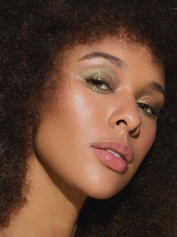 If you’re looking for a shimmering effect without noticeable specks or sparkles, opt for holographic face and eye makeup products—you can even rock a holo pout! “Holographic makeup, including highlighters, eyeshadows, and lip glosses, gives a futuristic, multi-dimensional effect,” Wulff says. “Apply a holographic or iridescent highlighter on your cheekbones, brow bone, and cupid's bow to achieve a glowing, almost otherworldly look.” Hoping for a light-reflecting lid look? “Use a holographic eyeshadow or top your eyeshadow with a shiny, metallic finish for an extra pop,” Wulff says. Ready to make your lips the star of the show? “Try a holographic lip gloss for an ultra-glossy, prismatic effect,” Wulff says. And remember: The goal is to look ethereal for festival season. With that in mind, Wulff says to choose shades like lavender, teal, or iridescent pink.