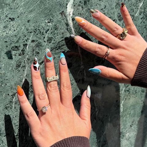 Floral nail art might not be groundbreaking but it is pretty perfect for summer. “Delicate floral designs are timeless and elegant and always look beautiful in the summer,” Hanna says. They're also a bit nostalgic. “When Hailey Bieber announced her pregnancy, all of our eyes were on her mani,” Van Iderstine says. “She sported a sweet cherry blossom design that reminded us of ‘90s manicures.” You can use a fine liner brush or nail art stickers to get the look.