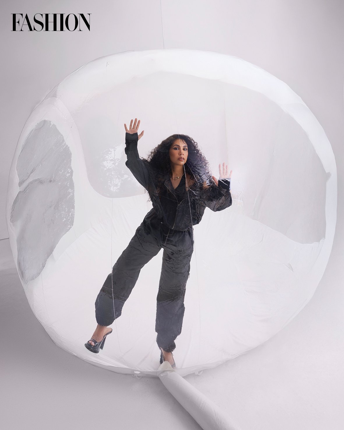 Catsuit and gloves, Brielle. Undergarments, Knix. Shoes, Thom Solo. Necklace, Vitaly x Luar.