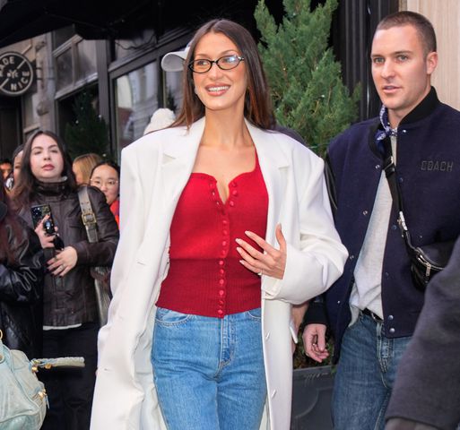 Meanwhile, the hemline of Hadid’s ranch-coded jeans showed off a pair of strappy red heels in the same color as her sweater, keeping with the festive theme. The model kept warm by layering with a midi-length winter white peacoat, which she wore open to show off her separates underneath. She held a large black leather bag decorated with a red and white scarf at her side.