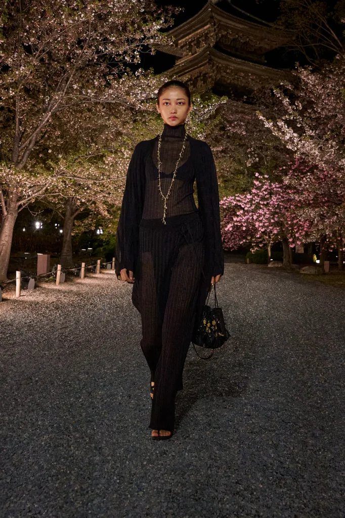 KYOTO, JAPAN: As dusk fell on the historic gardens of the Tō-ji Temple, the location for the Dior Fall 2025 show, cherry blossom trees were warmly lit to great detail. So much so, you could—even at a distance—make out the different shades of their pink petals: blush, taffy, tea rose.