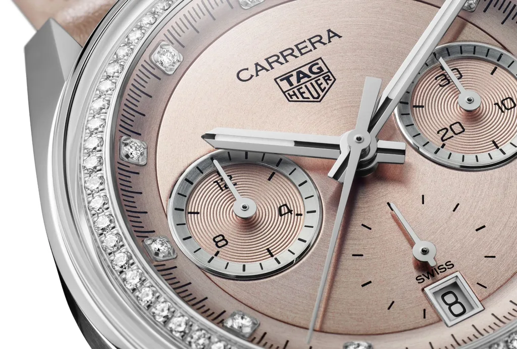 The collaboration is perfect for Daddario, who’s regularly spotted trackside. In TAG Heuer’s The Chase for Carrera campaign, she brings a sporty-cool elegance, pairing her pink Carrera Date with a leather racing jacket. And she’s not alone in her dedication to the sport. Ask any gen Z or millennial woman and they’ll likely recognise fan-favourite drivers Daniel Ricciardo, Lewis Hamilton and Max Verstappen.