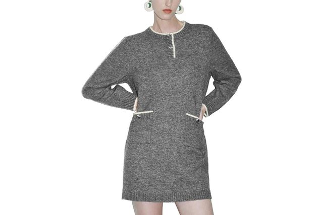 This minidress gives me a “Carrie Bradshaw on ice skates” vibe. To raise the hemline a bit further, I would belt it as she did and pull the look together with earth-tone knee-high boots.