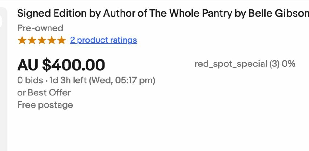 Unfortunately, it seems like a booming market for Belle Gibson‘s 2014 cookbook The Whole Pantry on eBay.