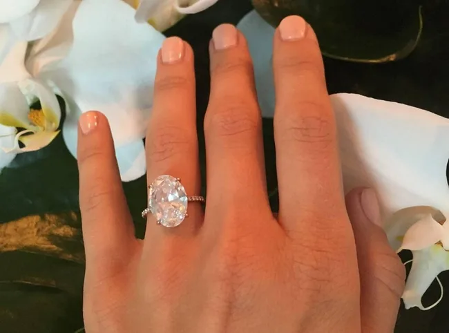Victoria’s Secret model Jasmine Tookes announced her engagement to Snapchat business developer Juan David Borrero when he proposed with a breathtaking 7-carat oval-cut diamond set in 18kt yellow gold, along with a hidden halo and diamond-embellished prongs. According to Brides, the ring cost over US$250,000 and is nothing short of blinding.