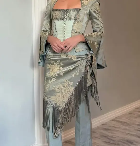 The corset has also been a favourite of designers like John Galliano, whose theatrically romantic sensibility made the boned bodice a recurring motif throughout his career (Robbie wore an archival Galliano piece — a pink feather-trimmed brocade coat from his Spring-Summer 1992 collection — during the London press tour leg as well as a long sleeve top). Maison Margiela, where Galliano has long served as creative director, has similarly incorporated corseted silhouettes across many collections. Meanwhile, contemporary designers like London-based Dilara Fındıkoğlu — who became something of the unofficial house designer of the Wuthering Heights press tour — and in Australia, All is a Gentle Spring, have embraced the theatrics of the silhouette for their office siren wasp-waisted tops.