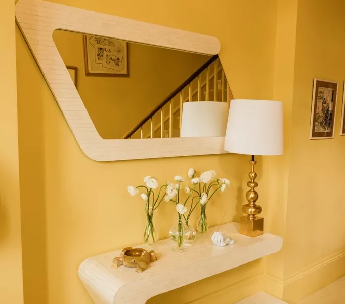 Unlike her choices for her label, famed for its bold, eclectic prints, at home von Halle eschewed pattern in favour of colour blocking. ‘I look at prints all day long for work, so I need a cleanse,’ she explains. The palette here includes Sanderson’s sunshine yellow Ming Gold paint in the hallway, a cocooning hue–Benjamin Moore’s Delicate Peach – in the main bedroom, and a shrimp-pink, BYR201 by Mylands, in the drawing room(‘the whole space glows – it’s like being in the womb’), with co-ordinating lacquer side tables. ‘We spent a lot of time on colour when decorating. It was important to get it right. Every room you walk into provides a complete experience – it’s like a psychedelic trip.’