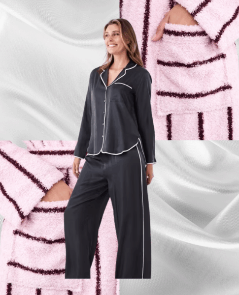 Plus, it wouldn’t be a perfect winter’s evening in without blending function and aesthetics by layering your satin set with a striped, pink fleece dressing gown.