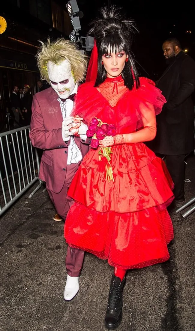 Bella Hadid and the Weeknd as Beetlejuice and Lydia Deetz.