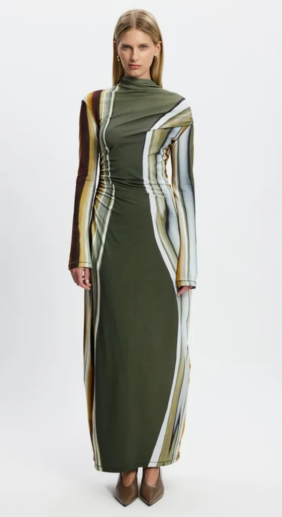 - Meshki, Estella Chiffon Cowl Maxi Dress Leopard Print $199.00, Meshki (here’s why)